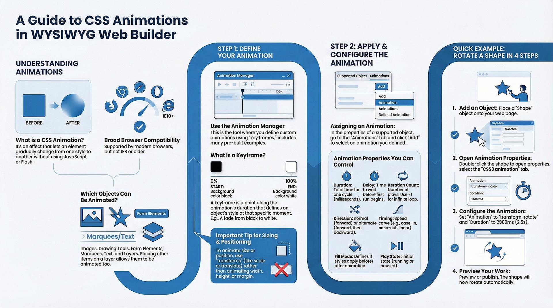 WYSIWYG Web Builder has built-in support for CSS3 animations. Animations are supported by all modern browsers It will work in FireFox/Safari/Opera/Chrome/IE10 but not by Internet Explorer 9 or older!