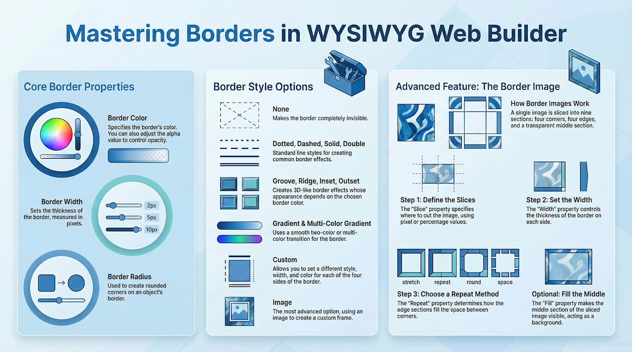 Borders are a fundamental design tool in WYSIWYG Web Builder that help you define the look and feel of page elements. With border properties, you can control an object’s style, width, color, and even add rounded edges or custom decorative frames to enhance visual appeal. Whether you’re highlighting text, framing images, or separating sections, understanding how borders work gives you greater creative control over your design. In this tutorial you’ll learn how to configure standard borders, explore advanced border styles like gradients and images, and see how these settings can transform the presentation of your web page elements.