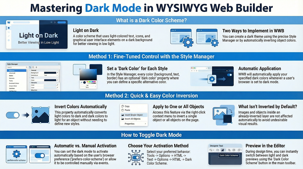 In WYSIWYG Web Builder, you can create a different color scheme for web site visitors who prefer dark mode. There are two ways to implement dark mode: via the Style Manager, where you can specify dark colors or by automatically inverting the colors of an object, so light colors become dark and dark colors become light.
