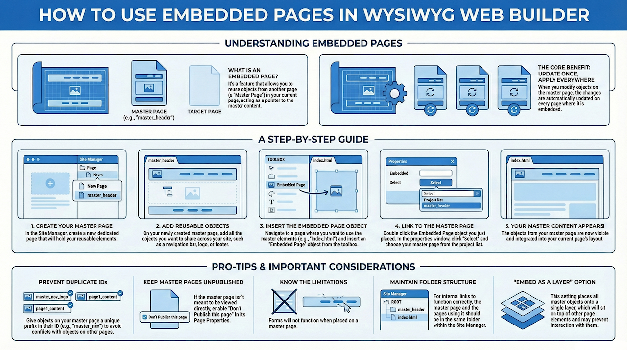 In contrast to inline frames, when using the Embedded Page object, all objects from that page are merged in the current page as if they are really a part of the page. You must however edit them in the master page.