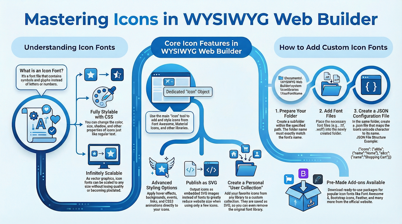 The font files should be placed in a sub folder of the \Documents\WYSIWYG Web Builder\system\iconlibraries folder.