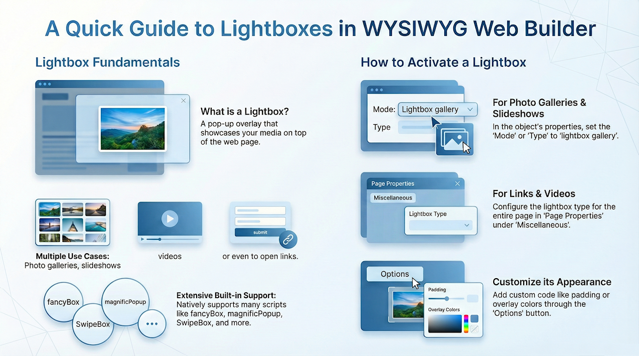 WYSIWYG Web Buider already has support for the many popular third party lightbox scripts, but if you have found one that is not supported yet, then you can add it yourself.