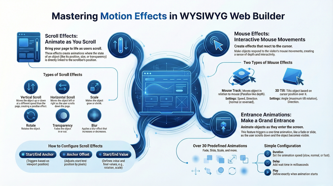 In previous versions, WYSIWYG Web Builder supported motion effects through scroll transitions. Here you had to define multiple steps to implement scroll effects. In WYSIWYG Web Builder 16, we have simplified this process so you can implement some frequently used effects with just a few clicks.