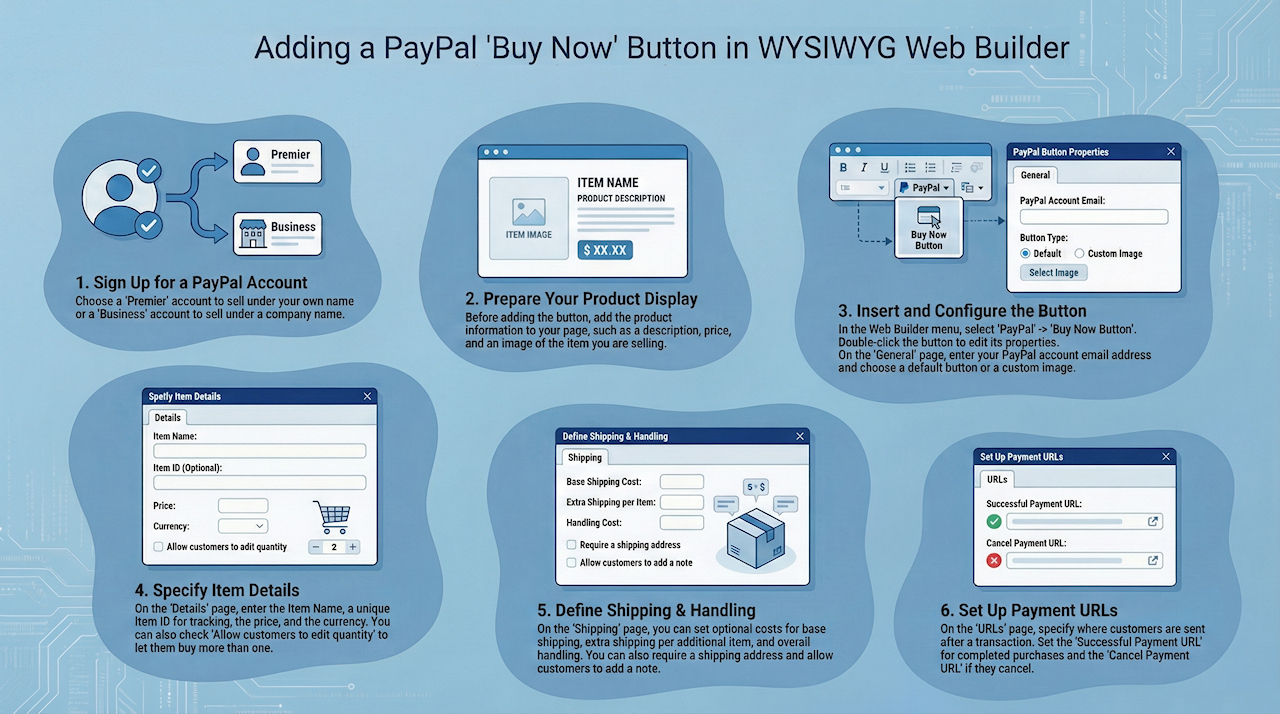 WYSIWYG Web Builder makes it even easier to integrate PayPal payment option into your website. You can add 'Buy Now' one-click buttons, setup a donation link or even connect to PayPal's own shopping cart system. Using these services is free- all you pay for are the transactions. In this tutorial we'll give you an introduction how to add a 'Buy Now' button to a static website.