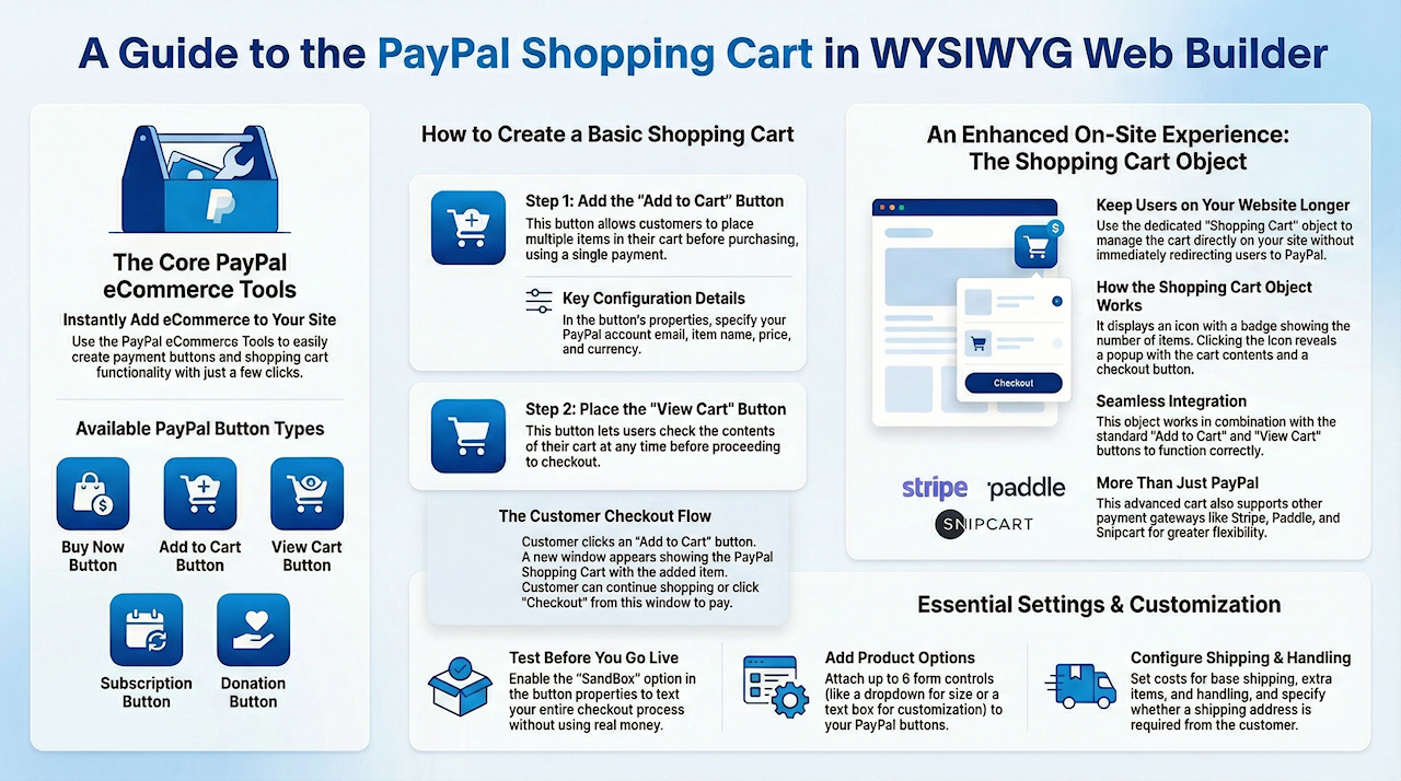 If you want to setup your own e-commerce store then PayPal is one of the easiest ways to add payment facilities to your website. It's quick and simple to sign up for a PayPal acoount, whether you're using it for personal or business purposes. WYSIWYG Web Builder makes it even easier to integrate PayPal payment option into your website. You can add 'Buy Now' one-click buttons, setup a donation link or even connect to PayPal's own shopping cart system.