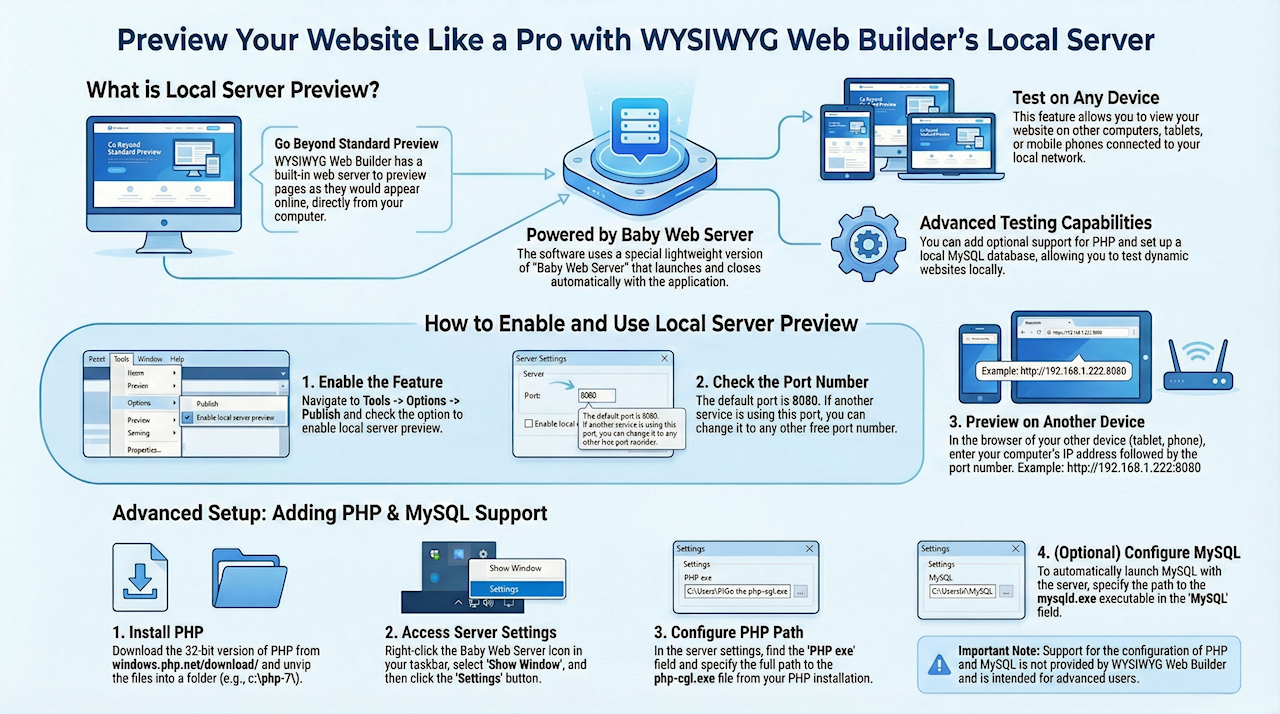 The software includes a special lightweight version of “Baby Web Server” (by Pablo Software Solutions) which will be launched automatically the first time you use preview. The server will be closed when you close the software. Another benefit of using local server preview is that you can add (optional) support for PHP or even setup a local MySQL database server with PHPMyAdmin.