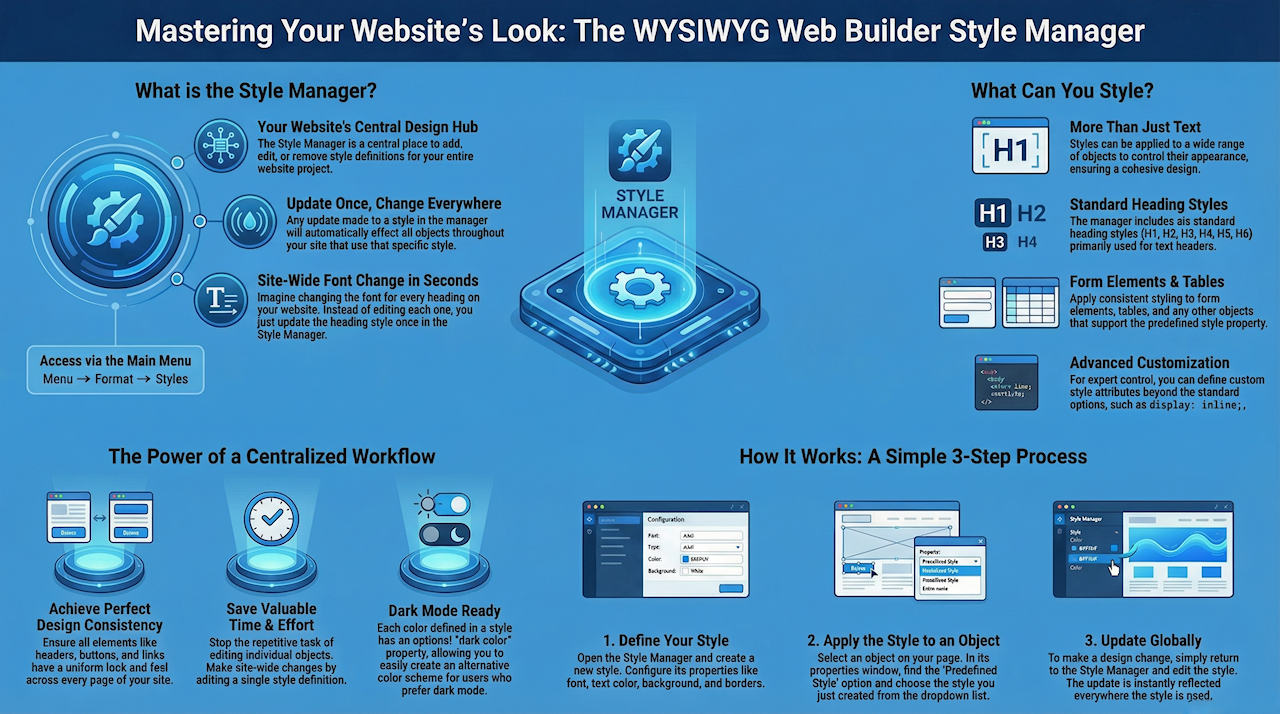The Style Manager is a central place to add, edit or remove CSS style definitions for the entire website.