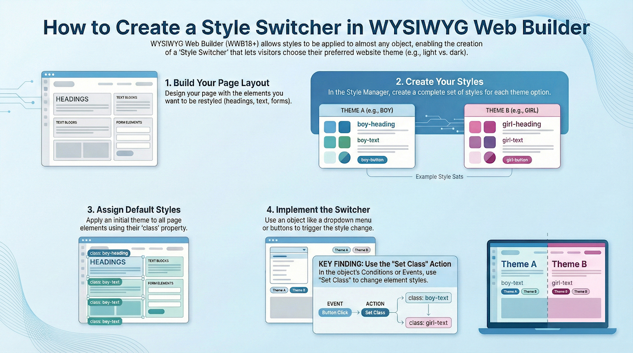 In WYSIWYG Web Builder, you can use styles in almost any object. Using styles not only makes it easier to maintain the overal style of your website, but we can also make it possible to allow your visitors to choose the way they see your site by implementing a 'Style Switcher'.