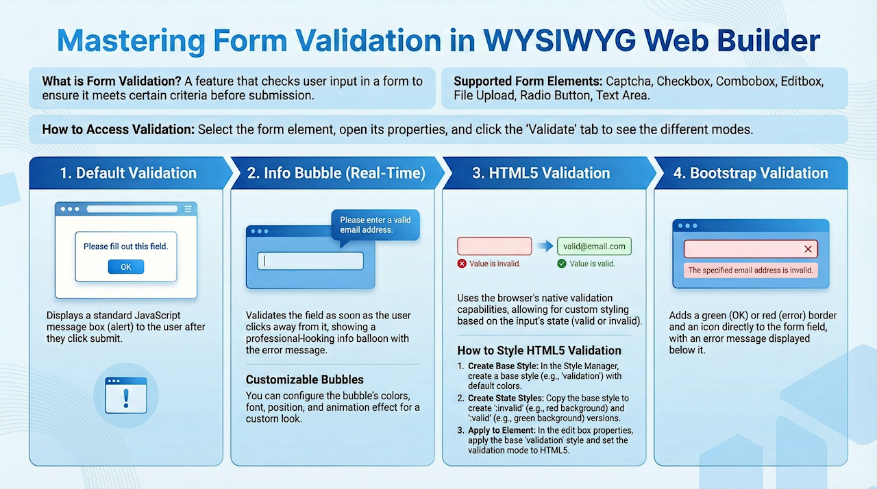 One of the great features of WYSIWYG Web Builder is the powerful form tools. Not only can you easily create forms with the Form Wizard or create them from scratch with the form elements in the toolbox but there are also several form validation options.