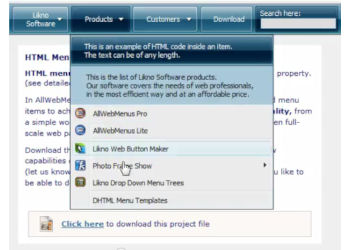 Likno's AllWebMenus is a DHTML menu/JavaScript menu builder to create any kind of popup or drop-down menu for your web navigation needs, without programming experience required. Use plenty of stylish themes to easily build SEO-friendly web menus, CSS menus, Sliding menus, Floating menus, Mega drop-down menus, AJAX menus etc. that work alike in all DHTML browsers (IE, Firefox, Mozilla, Safari, Chrome, Opera etc.) and all popular platforms (Win, Mac, Unix). Create pop-up, slide or drop-down menus with static or animated images, borders, effects, etc.