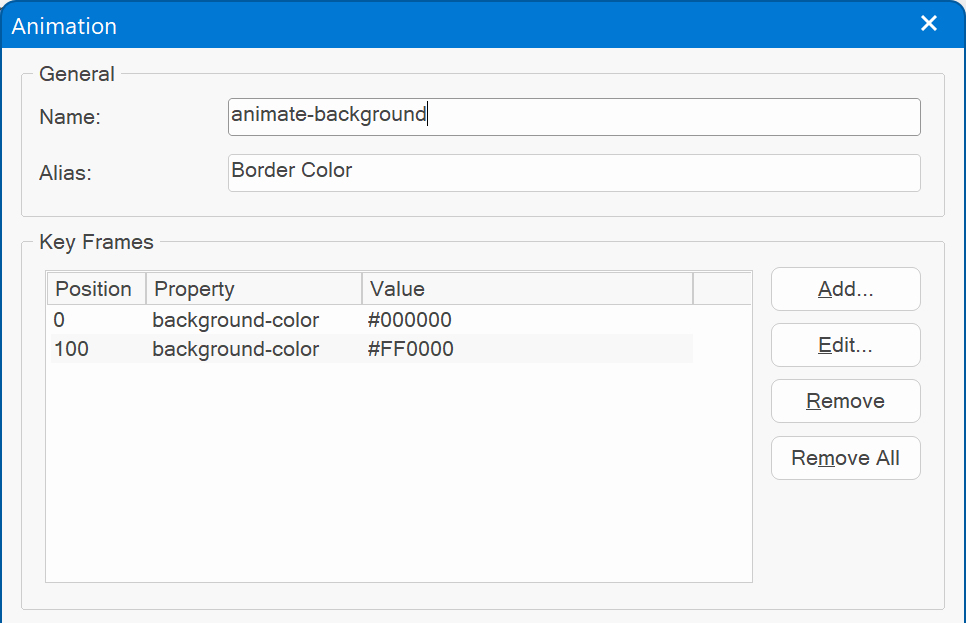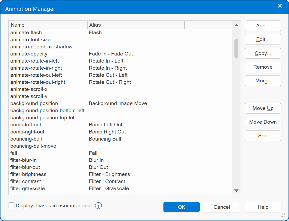 effects can be applied to a wide variety of CSS properties, including background-color, width, height, opacity, transforms (rotate, skew, scale, translate) and many more. The Animation Manager can be used to define animations. These animations can be assigned to an object in the CSS3 Animation section of the object's properties.