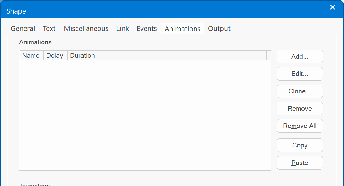 Objects that do support animations have an Animations tab in their properties. Here you can add, edit or remove animations.