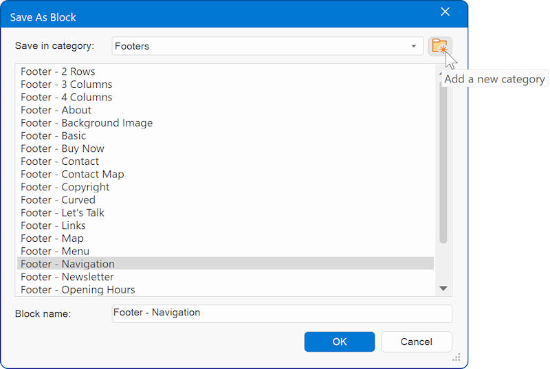 You can switch between different block libraries. Each block library can have its own set of blocks. For example, there you can have a dedicated library for dark blocks or ecommerce blocks.