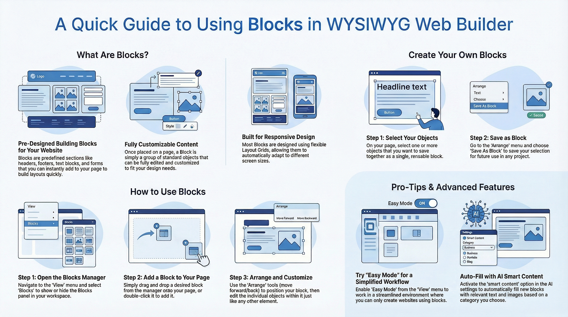 Blocks are basically just groups of standard objects, so once dragged to the page you can fully customize the behavior and appearance of the content. The application includes a dozen of standard blocks to help you get started, but you can also create your own blocks (by saving a group of objects as 'Block'), so you can reuse them in other pages or projects.