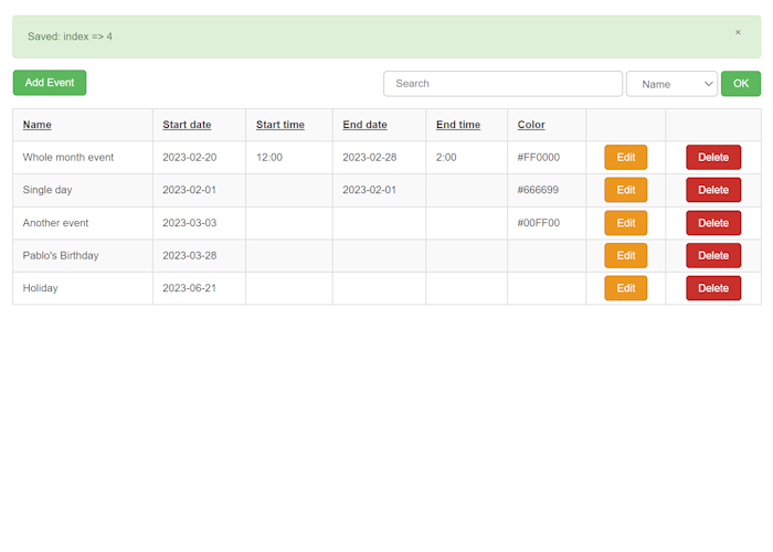 Calendar Admin implements a simple management tool for the WYSIWYG Web Builder calendar extensions. It will allow you to create, update and delete event records of a MySQL database or CSV via your website. For each event, you can set the event name, start date, start time (optional), end date (optional), end time (optional), color and url (optional). Although you can also manually update the calendar event table or CSV, this extension makes it easier to modify calendar events.