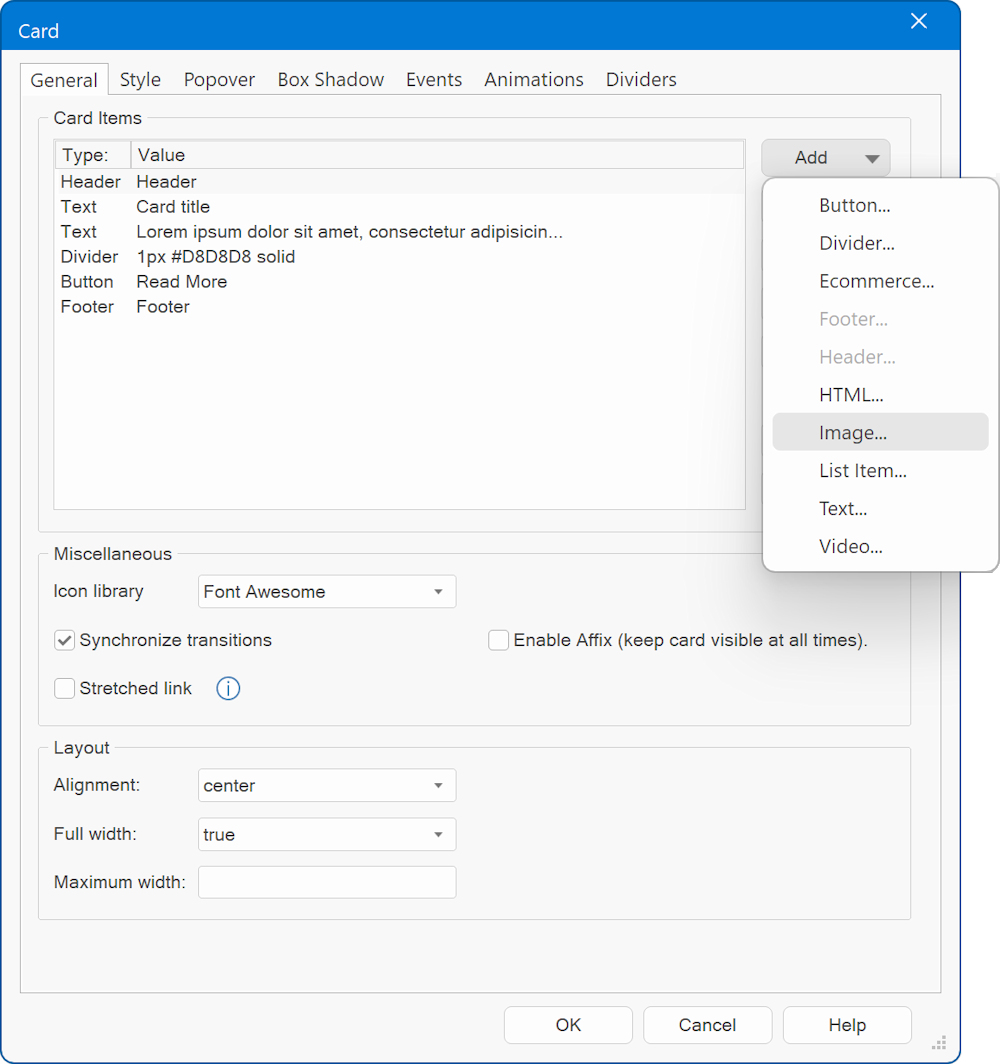 Add an image to the card. By default the image will be full width, but you can optionally set a width and height. These values are responsive and can be different in breakpoints. An image can either be inline or overlay. When set as overlay it will be rendered behind all other items. You can only use one overlay images per card.
