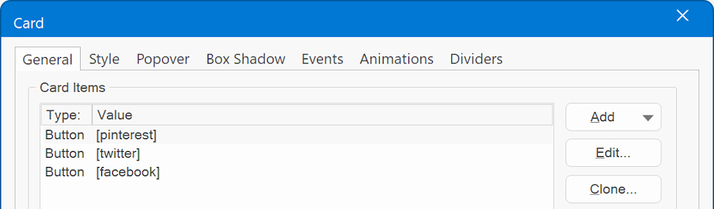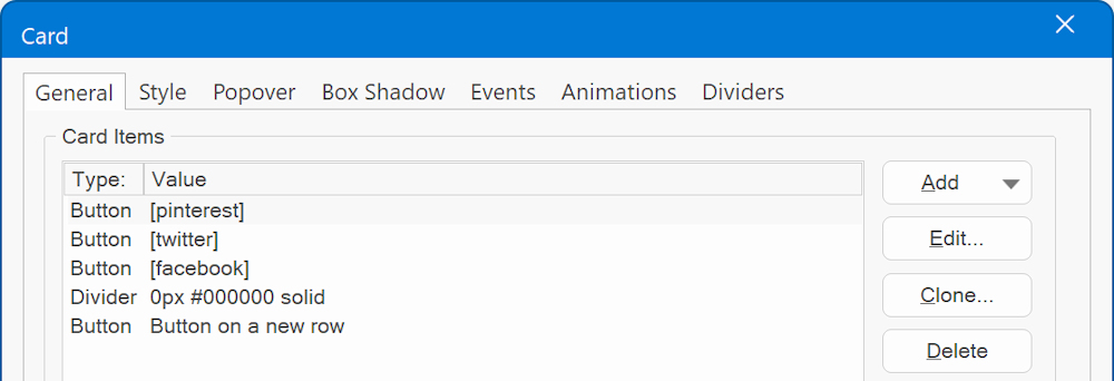 The Card support different content types, like Header, Footer, Text, Buttons, Dividers, Video and/or Images.