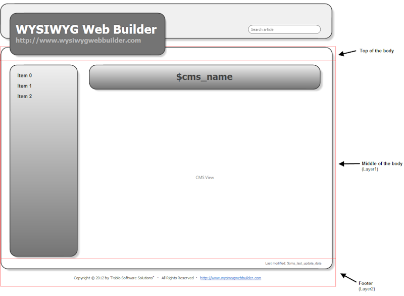 • Footer (layer), which contains the bottom of the body and the copyright message (this part will move down if the height of the content increases).