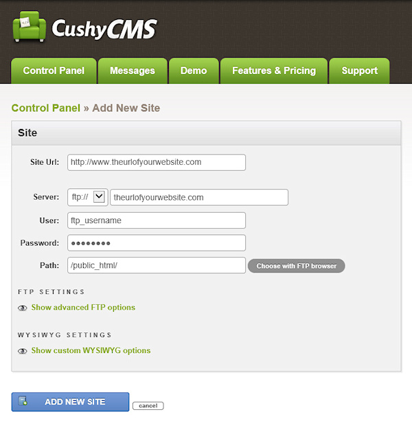 Go to the website: https://www.cushycms.com/ and click 'Sign Up'. Configure the site details, like the Site URL, FTP account and page location. Further details about the setup can be found in the CushyCMS documentation.