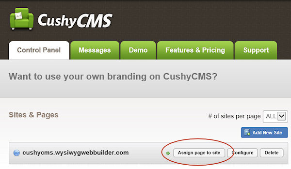 In your CushyCMS account go to Sites & Pages and and click Assign page to site