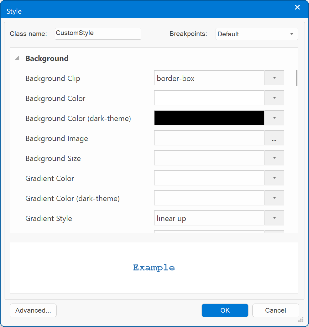 In the Style Manager, each color also has an (optional) dark color property, where you can set a different color for the background, text, border when the browser runs in dark mode. WWB, will automatically use the dark color when the dark color scheme is active.