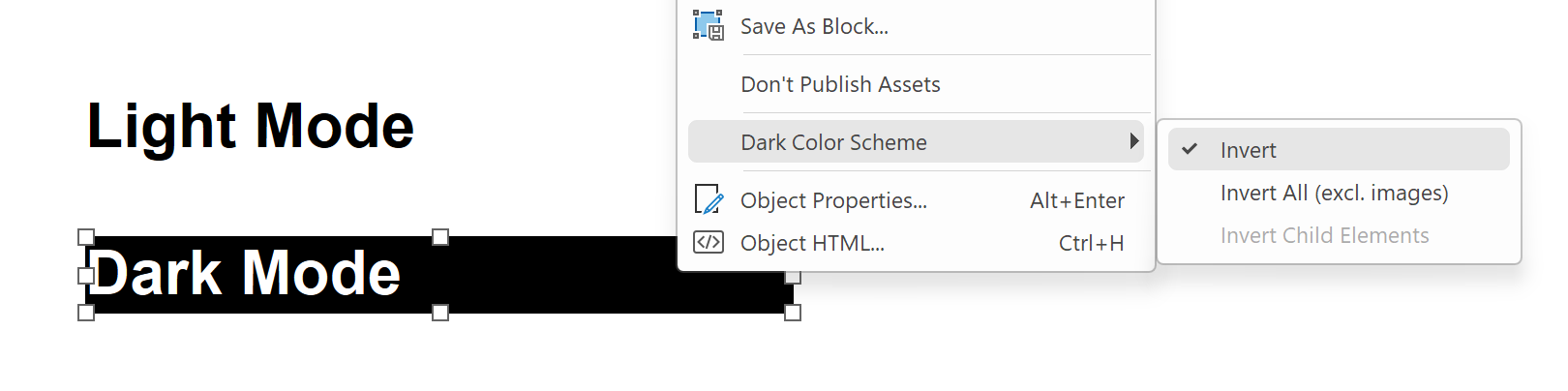 Besides dark mode styles, WWB also has the possibility to invert the colors of an object for the dark color scheme. In that case, you do not have to use styles, but all colors will be inverted (negative) automatically. This property can be set for each object individually.