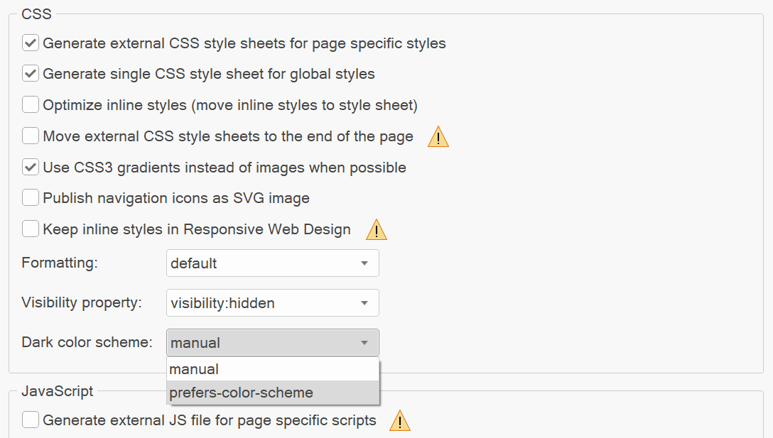 In WYSIWYG Web Builder, you can create a different color scheme for web site visitors who prefer dark mode. There are two ways to implement dark mode: via the Style Manager, where you can specify dark colors or by automatically inverting the colors of an object, so light colors become dark and dark colors become light.