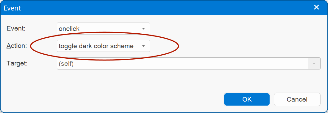 For manual mode, there is a dedicated event action to toggle the color scheme. This can be used with any object that support events.