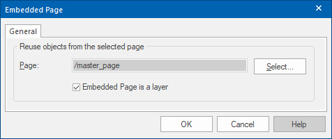 Double click the object you've just inserted to select a page. Next click the Select-button to display the Select Page window and choose master_page from the list. Click OK to return to the page.