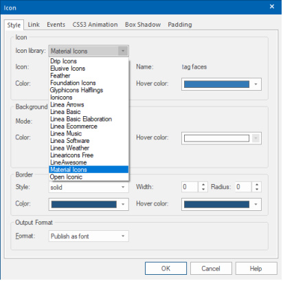 This WYSIWYG Web Builder has a dedicated Icon object for Font Awesome, Material Icons and other icon libraries with many styling options like hover, backgrounds, events, links, CSS3 animations and more. It is also possible to add your own or third party icon fonts by using the "Icon" object.
