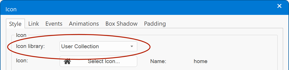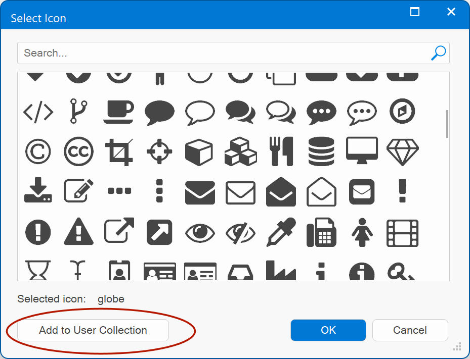You can add any icon from any icon library. The icons from the user collection will be saved in SVG format, so you can even remove the icon library from your computer if you no longer need the other icons!