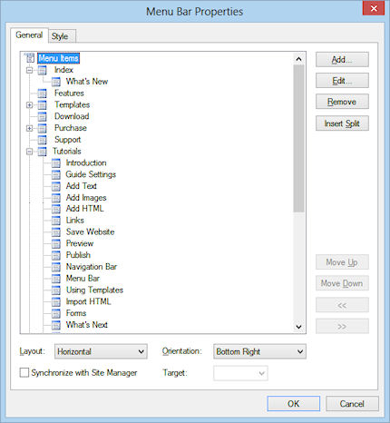 Select Add to insert a new item to the menubar or Edit to modify the properties of an existing item. To remove an item from the menubar select Remove. You can rearrange the items in the menu you can use drag and drop to move the items around or by using the Move Up, Move Down, Move Left (<<) or Move Right (>>) buttons. The Insert Split button inserts a splitter/divider in the menu. The menubar can be either Vertical or Horizontal.