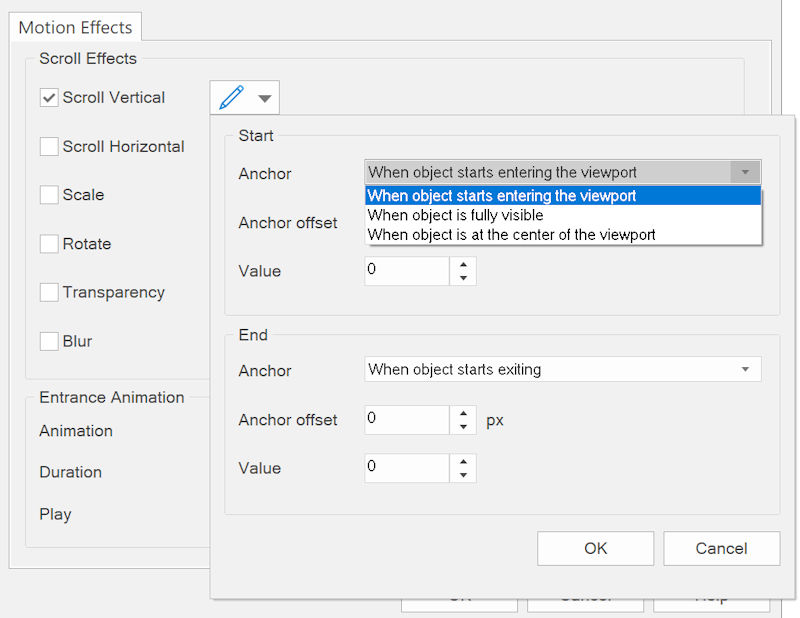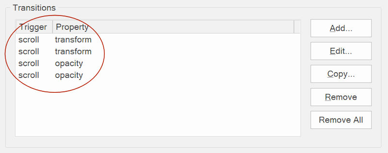 In the background, 'scroll effects' uses standard transitions. So, if you activate one of the options then this will automatically add new transition items in the 'Animations/Transitions' properties of the object. It's not recommended to update these values manually unless you know what you are doing.