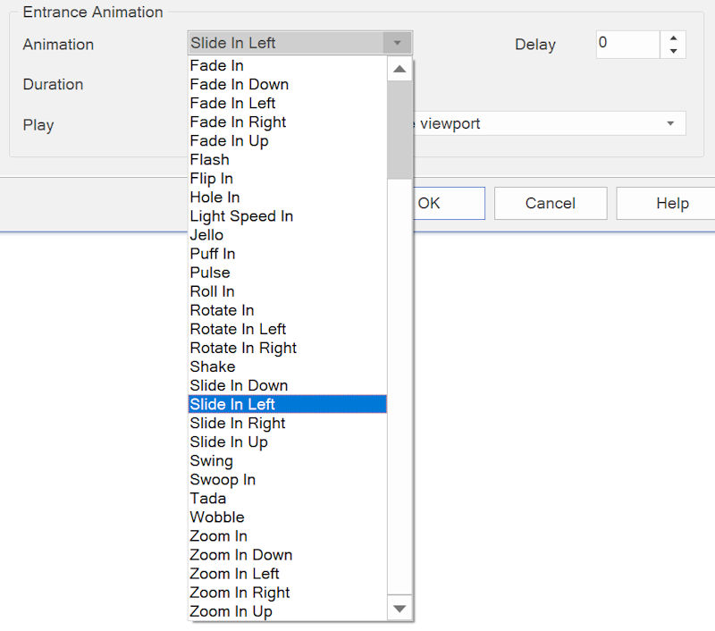 You can choose from more than 30 animations. Duration specifies the duration of the animation (slow, normal or fast) and Delay can be used to wait for x milliseconds before the animation starts. Play specifies when the animation starts.