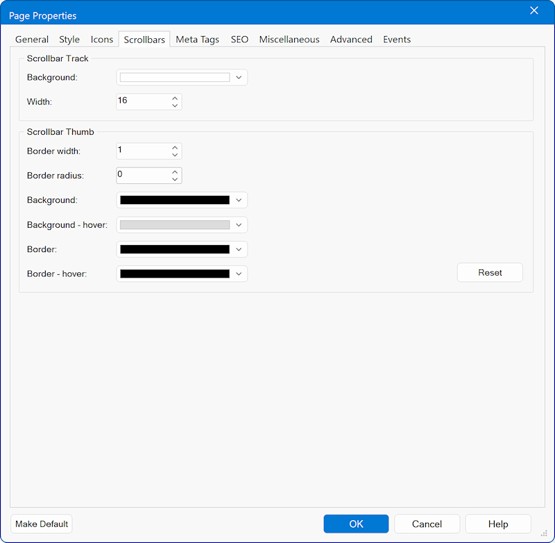 Restores all scrollbar settings to default values, removing any custom colors or styles.