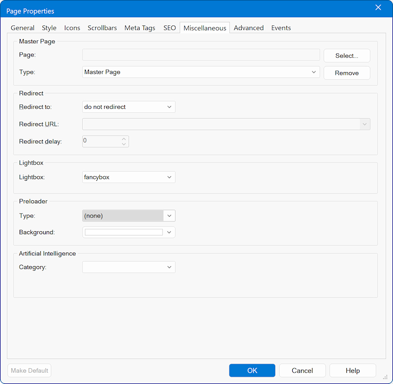 This section includes advanced options for page redirection, page layout structure, media display (lightboxes), and loading animations.