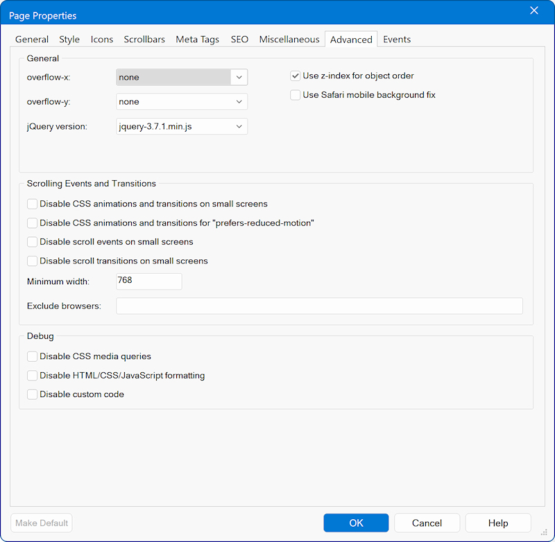 This section allows you to fine-tune how overflow content behaves and configure advanced features for layout control, testing, and performance optimization.