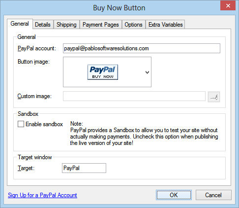 Next we'll insert the Buy Now button, select PayPal->Buy Now Button from Web Builder menu. Double the object to edit its properties. In the General page you should enter the email address of your PayPal account. You can use the default Buy Now button design or you can choose another button. Alternatively, you can use your own custom image.