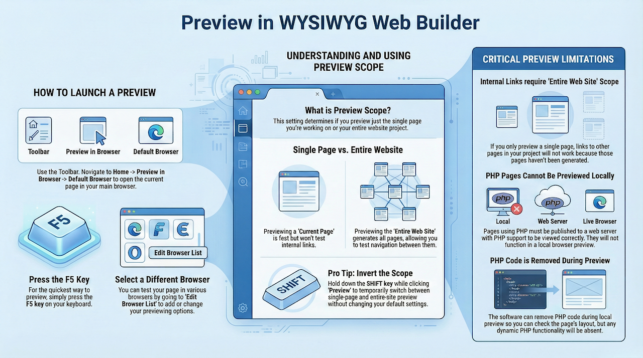Depending on the preview scope, you can either preview a single page, the entire web site or pages currently opened.