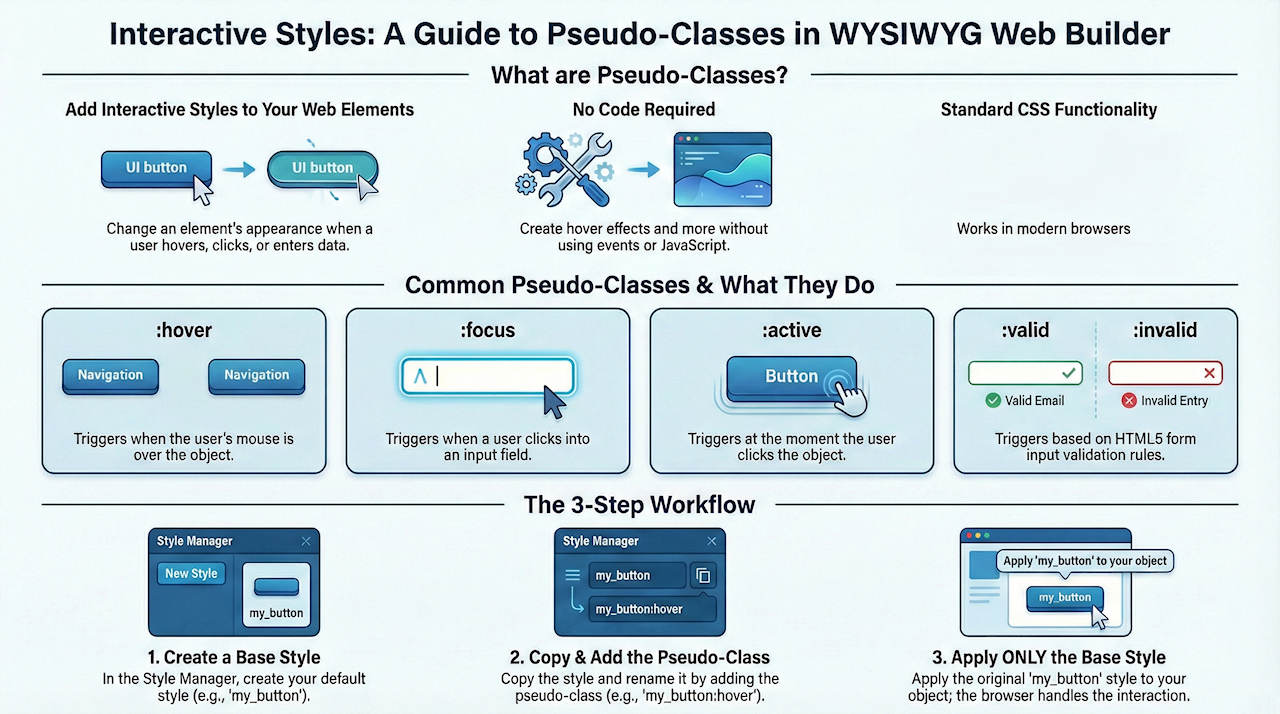 We will demonstrate the usage of pseudo classes with the form elements button and editbox. Requires WYSIWYG Web Builder 8.5.2 or newer!