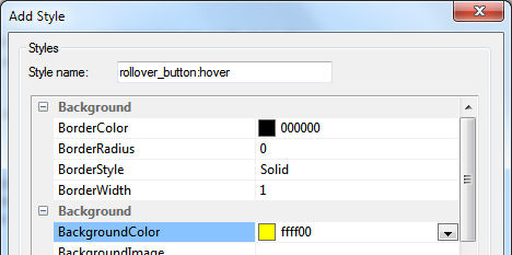 Open the Style Manager and add a new style. Name it 'rollover_button'. Specify the following values: