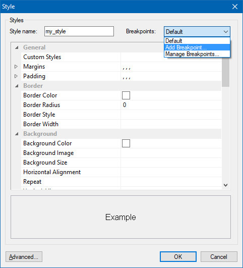 To add a breakpoint to Styles, select 'Add breakpoint' in the Breakpoints drop down menu. You can use 'Manage Breakpoints' to add, edit or remove breakpoints. To switch to another breakpoint to edit the properties, select the value in the drop down menu or select 'Default' to go to the default properties.