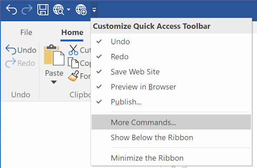 The Ribbon includes a Quick Access Toolbar. The Quick Access Toolbar is a small, customizable toolbar that provides access to frequently used commands independent of which Ribbon tab is selected. By default, the Quick Access Toolbar is located in the title bar of the application window, but it can be configured to display below the Ribbon. You can also add buttons like Save, Publish or remove any of the existing ones by clicking 'More Commands'.