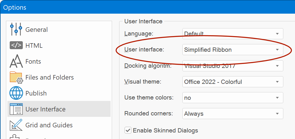 The Simplified Ribbon is a mix between the classic toolbar and ribbon. It shows the commands in a single line which not only brings a modern interface to WWB but also frees up space to show more of the page you are working on.