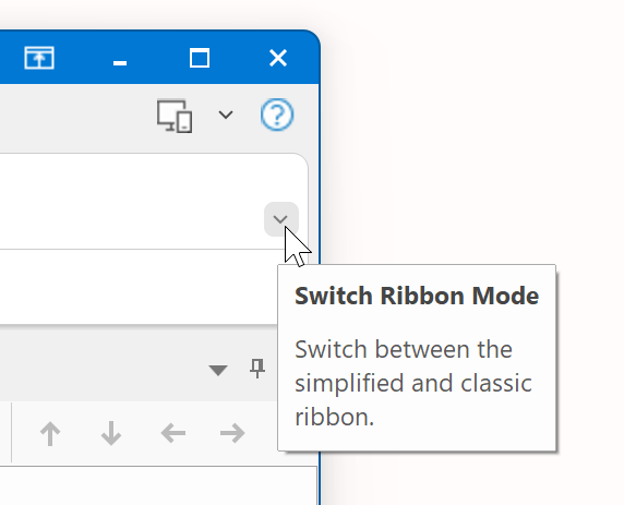 Because there is less space available, all buttons might not be visible. If you want to switch back to the classic ribbon where you can see more commands, simply click the downward pointing arrow in the lower right corner of the ribbon to expand it. Use this arrow control to switch between the simplified and classic ribbon.