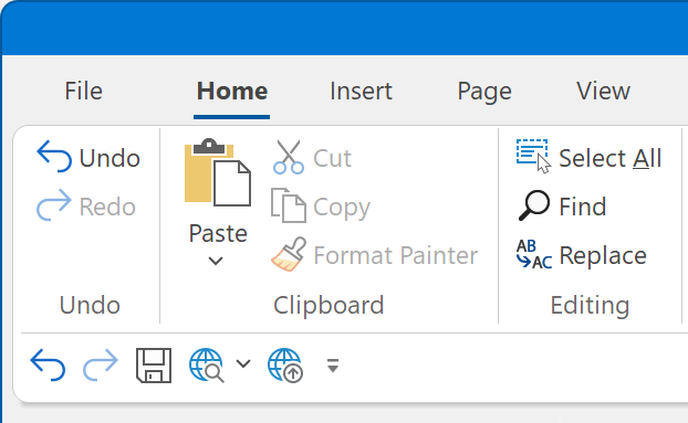 The Ribbon replaces traditional toolbars and menus with tabbed groups (Categories). The Ribbon commands are grouped by functionality. For instance all page tools are available in the 'Page' tab. In addition, Ribbon control provides smart layout maximally utilizing the available space. For example, if a Panel has been stretched and has no place to display all available controls, it becomes a menu button which can display sub-items on a popup menu.