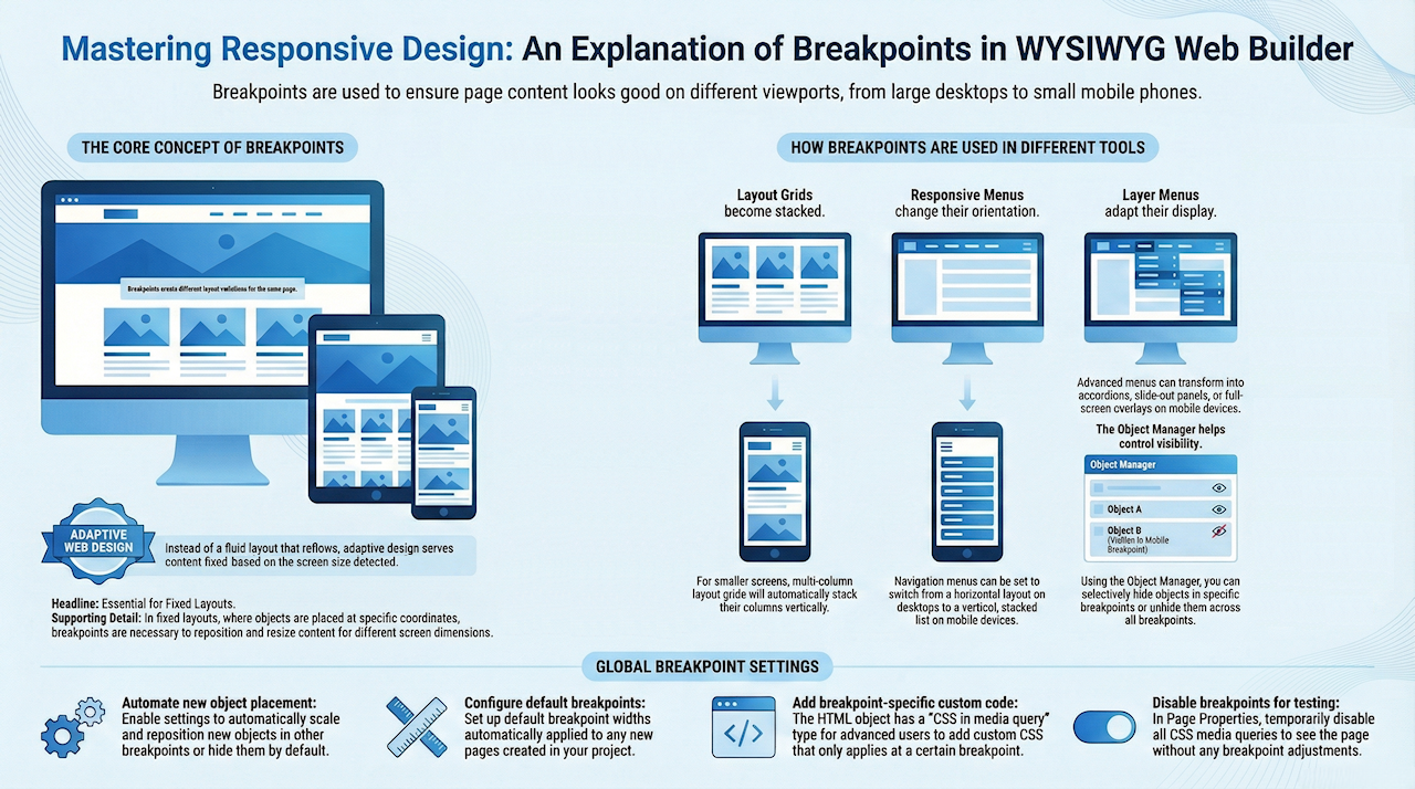 Tip: Instead of using absolute/fixed layout and breakpoints, you can also create flexible layouts in WYSIWYG Web Builder! When using Flexible / Floating Layouts (Re-flow), the layout will automatically adjust to the screen size.