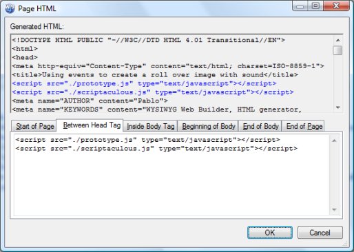 Step 5 Insert a File Publisher object (Insert->Advanced->File Publisher) and add these files: c:\scriptaculous\lib\prototype.js c:\scriptaculous\src\builder.js c:\scriptaculous\src\controls.js c:\scriptaculous\src\dragdrop.js c:\scriptaculous\src\effects.js c:\scriptaculous\src\scriptaculous.js c:\scriptaculous\src\slider.js c:\scriptaculous\src\unittest.js Step 6 Insert an image to your page (Menu->Insert->Image) and pay special attention to its ID in the Properties Inspector window.