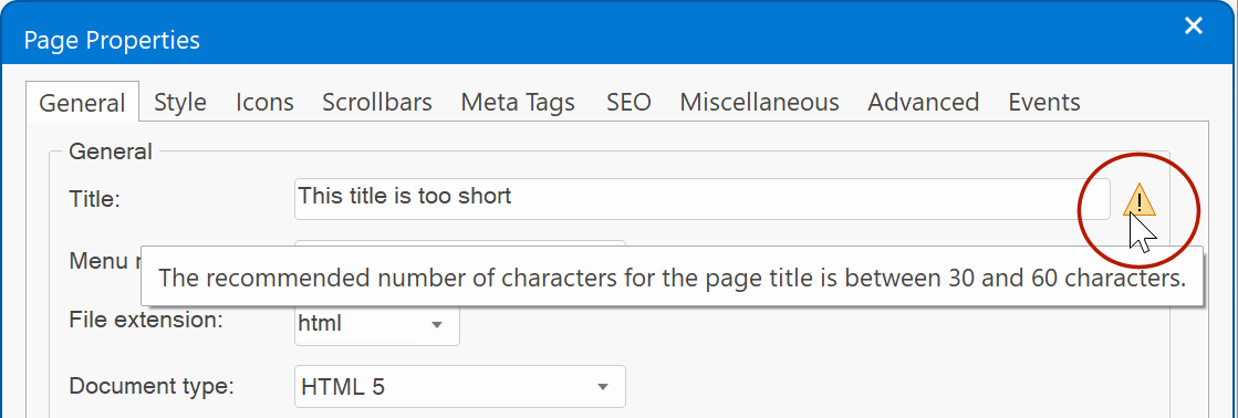In addition to the message in the SEO assistant, the Page Properties also shows a 'warning' icon if the title length is less than 30 or more than 60 characters.