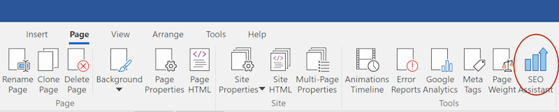 This tool helps you make your web pages more search engine friendly and improve the accessibility for users, including those with disabilities. The SEO assistant is available via the Page menu.